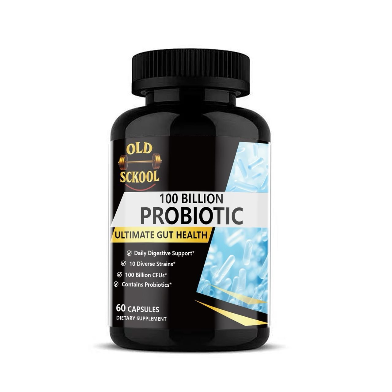 Old Sckool 100 Billion Probiotic is the ultimate formula for Daily Digestive Support and immune health. Each capsule delivers 100 Billion CFUs from 10 Diverse Strains to optimize your gut flora.