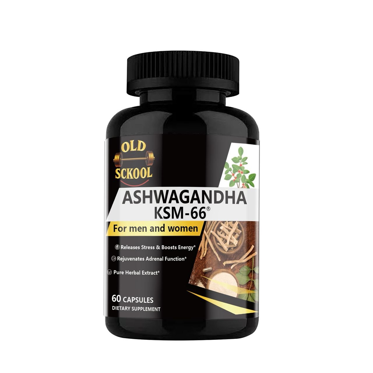 Boost your resilience with Old Sckool Ashwagandha KSM-66®. This 60-capsule dietary supplement is designed for both men and women to naturally Release Stress, Boost Energy, and Rejuvenate Adrenal Function. Featuring clinically backed, pure herbal KSM-66® extract for high potency.